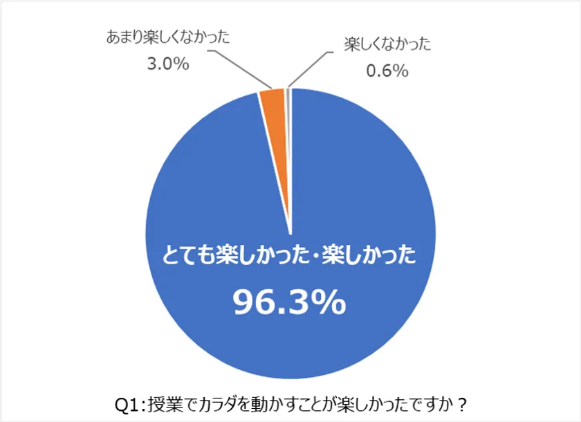 「Q1:授業でカラダを動かすことが楽しかったですか?」の質問に対して、96.3%が「とても楽しかった」「楽しかった」と回答