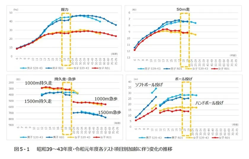 〈昭和39~43年度・令和元年度各テスト項目別加齢に伴う変化の推移〉