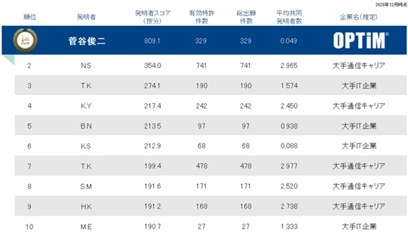 AI・IoT・ビッグデータプラットフォームのマーケットリーダーである株式会社オプティム(以下 オプティム)は、株式会社パテント・リザルト※1が集計した、1993年から2020年の日本の情報通信分野における特許資産個人ランキングにおいて、代表取締役社長 菅谷 俊二が第1位※2、※3となりましたことをお知らせいたします。