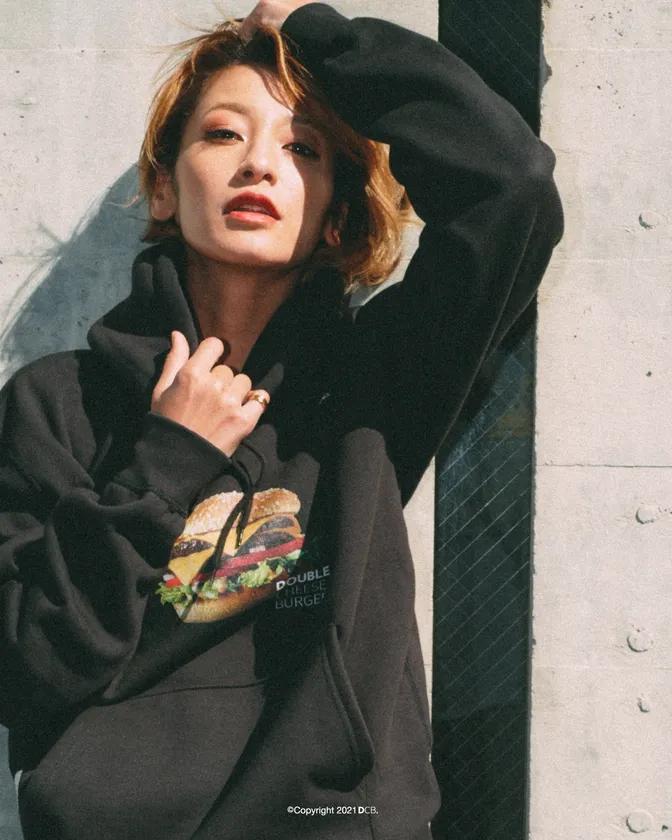 今回のビジュアルでは、DOUBLE CHEESEBURGER(R)の最新コレクションを含むFall/Winter2021アイテムを着こなしています。コーディネートに合わせた様々な表情にも注目。