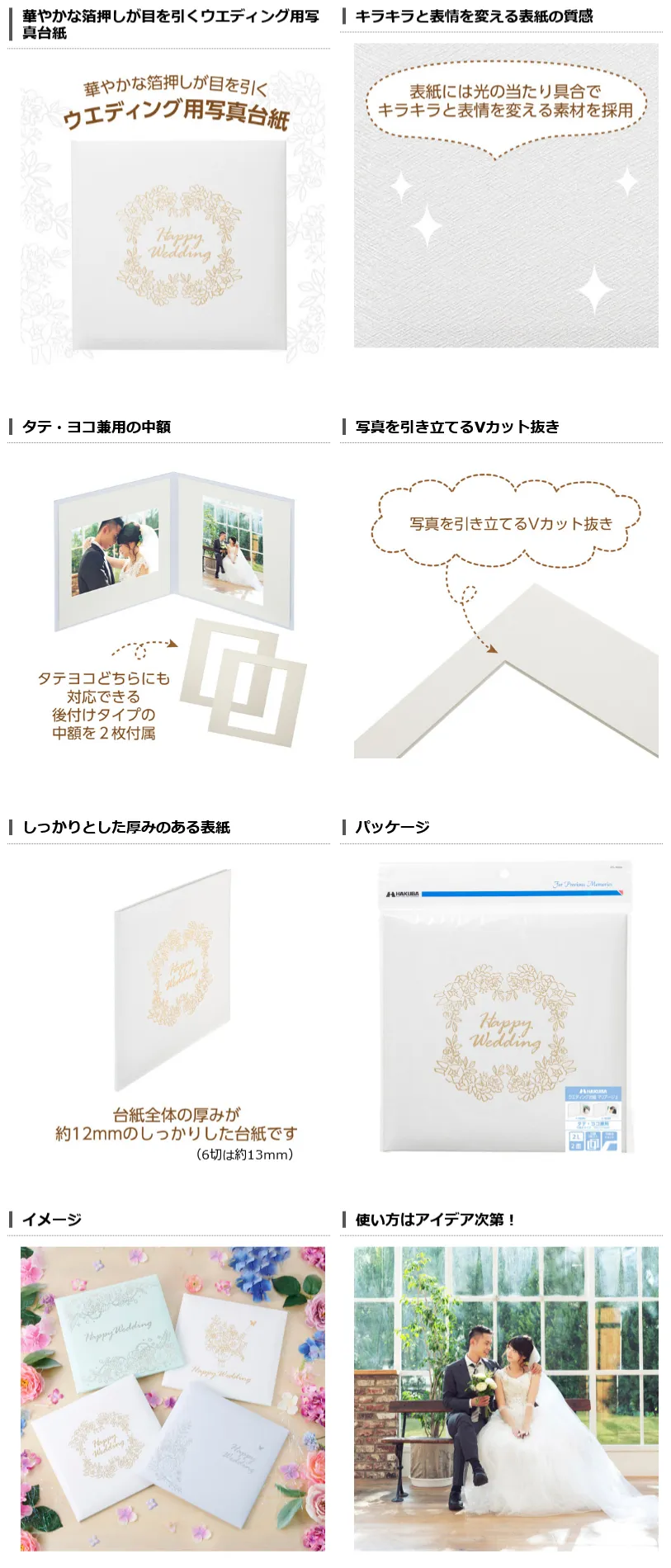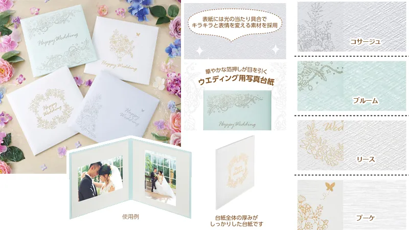 晴れの日を祝福する、しっかりした厚みと華やかな箔押しが目を引く婚礼用写真台紙。