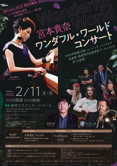 今注目のピアニスト&作編曲家・宮本貴奈が “ねりぶんJAZZ”に初登場 アルバム『ワンダフル・ワールド』に参加の 豪華アーティストたちによる、 初めてのホールコンサートを2月11日に練馬で開催!