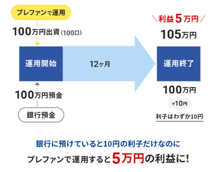 不動産クラウドファンディングで、出資金100万円、予定分配率5%、運用期間1年で行った場合とメガバンクの普通預金で、預金100万円、年利0.001%、1年間預金した場合を比較しました。すると、不動産クラウドファンディングの方が、5,000倍の利益を生むことが分かりました。