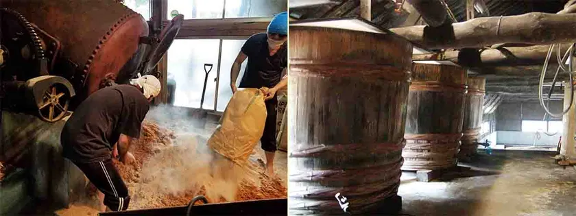 材料となる大豆や小麦などの厳選した素材から麹をつくり、発酵させて寝かせてから商品として出荷されるまで、最低でも2年をかけてつくられるこだわりの醤油。毎年春と秋に仕込み、週に一度の撹拌(かくはん)を繰り返しながら、季節に応じた管理方法を徹底。発酵と熟成を繰り返してできあがる醤油の原料となる“もろみ”は、よりおいしさが増します。特に気温が上がる夏を2回過ごさないともろみの発酵が完了せず、十分なうまみが引き出せません。徹底した管理体制と代々伝わる熟練の職人技により、昔から変わらない味をつくり続けています。
