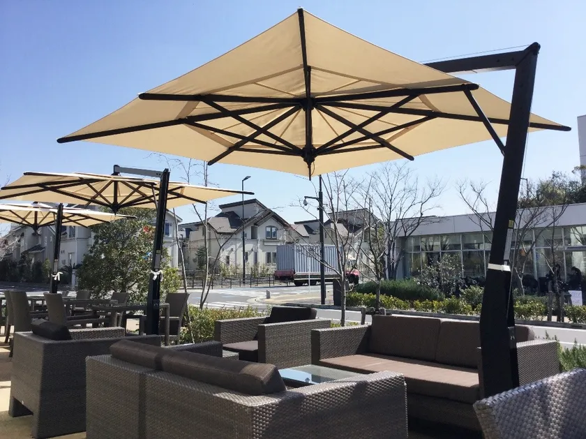 片持ち大型パラソル「ステラ」は、デザイン性が高いだけでなく、突風に対応したベンチレーションシステム搭載!