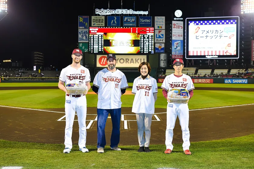 本協賛試合では、アメリカ産ピーナッツを原料に用いる4社の菓子製造・輸入メーカーにご協賛いただいたピーナッツ菓子商品の先着約4,000名へのプレゼント、6社の菓子製造・輸入メーカー・商社にご協賛いただいたアメリカンピーナッツ商品ギフトセットを球団贈呈式やファンプレゼント(来場者抽選プレゼント)、当協会の後援団体である在日アメリカ大使館の農務担当公使Morgan Perkins氏による始球式、コミュニティFMラジオ「Rakuten.FM TOHOKU」への出演などを実施いたしました。