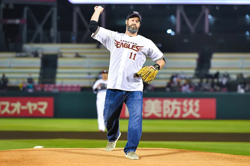 当協会の後援団体である在日アメリカ大使館の農務担当行使 Morgan Perkins氏による始球式が行われました。ユニフォームの背番号はピーナッツの日の11月11日にちなんだ「11」、捕手は東北楽天ゴールデンイーグルスの炭谷選手、打者はオリックス・バファローズの福田選手に務めていただきました。