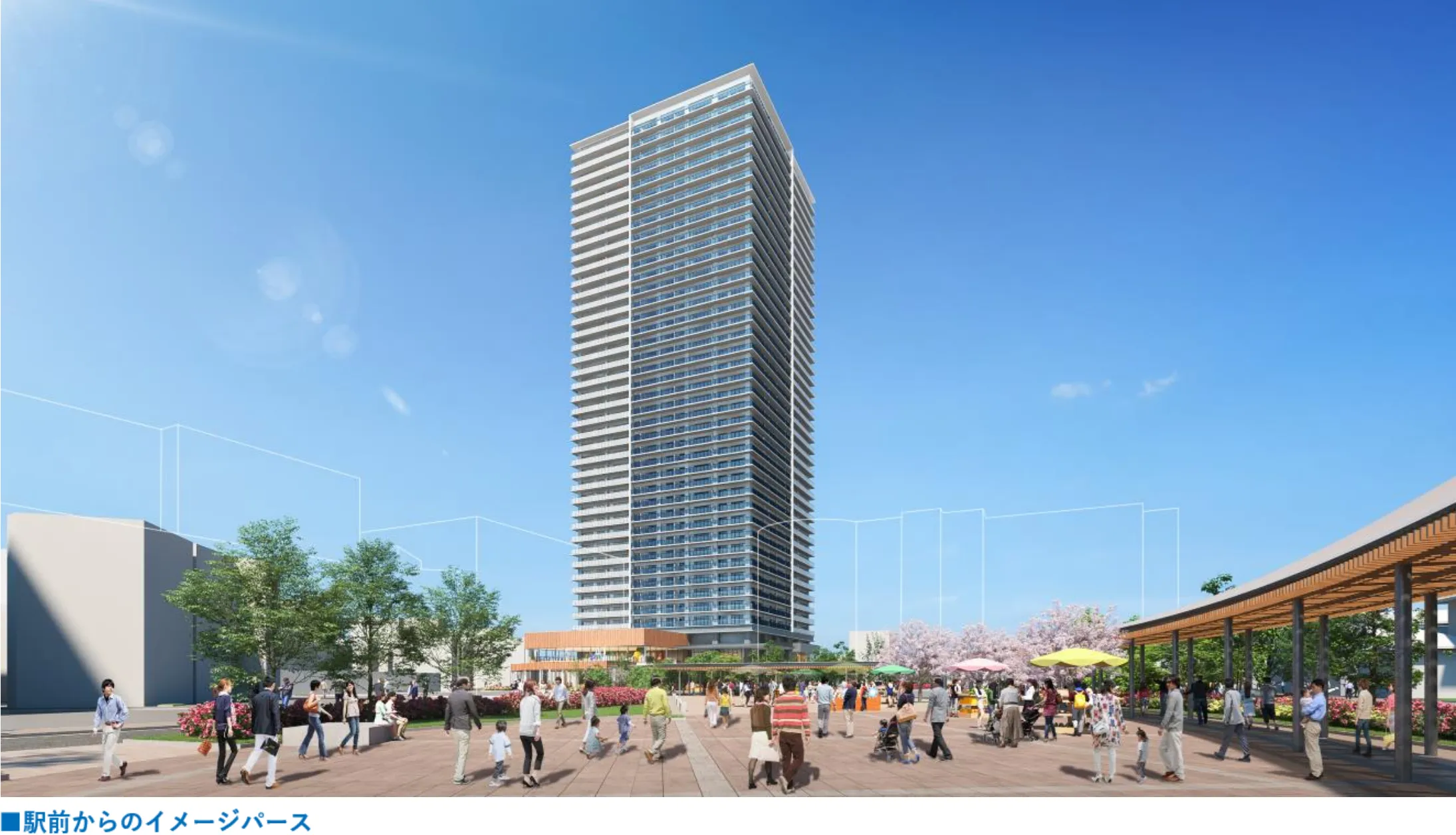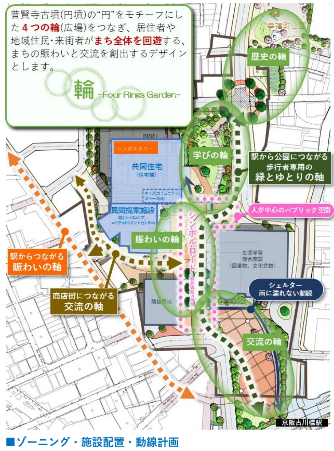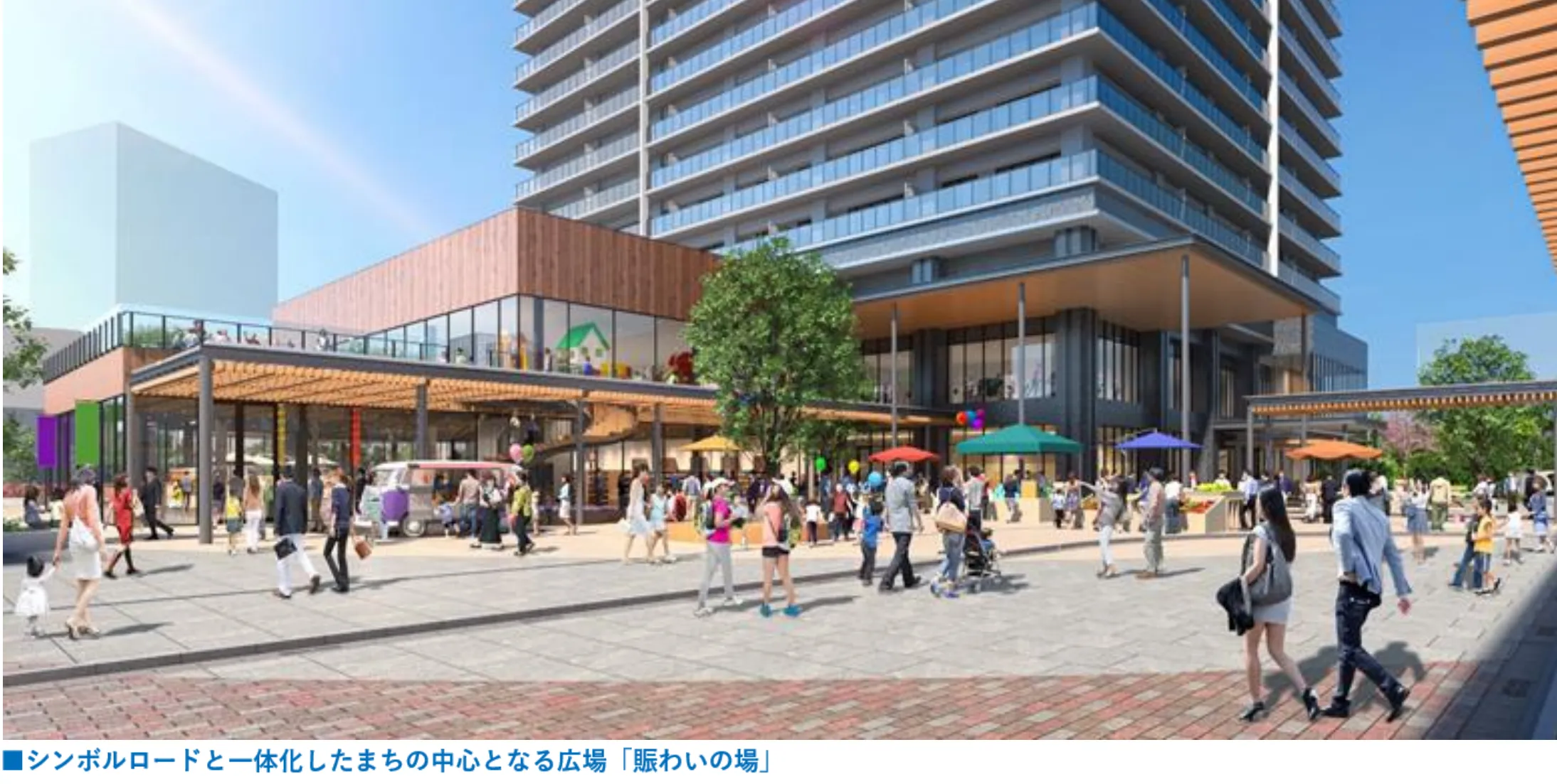 門真市は、京阪電車古川橋駅北側の門真市幸福東土地区画整理事業区域内(約2.8ha)において、門真市の顔となる中心拠点として、本事業用地及び(仮称)市立生涯学習複合施設(指定管理者候補者予定者カルチュア・コンビニエンス・クラブ(株))・交流広場をまちの核に位置づけ新たな賑わいが生まれる場となるよう、官民連携の手法によるまちづくりを推進しております。今回、当グループは本事業用地にて門真市初のタワー物件(地上41階、総戸数567戸)及び商業棟を計画し、地域に開放された広大な広場を設けることで新たな賑わいの創出に寄与致します。