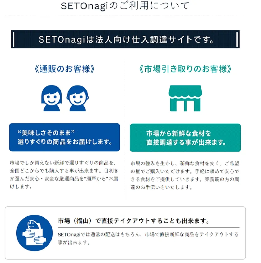 SETOnagiは法人向け仕入れ調達サイトです。「通販」「市場引き取り※」から、ご利用方法をお選びいただけます。