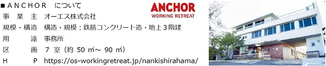 オーエス株式会社(本社:大阪市北区 取締役社長:高(※1)橋秀一郎)は、2021年11月1日(月)に和歌山県・白浜町にあるリゾートサテライトオフィスビル「ANCHOR(アンカー)」にて、企業や大学の研修合宿、アイデアソン・プロジェクト推進における一時利用等にご利用いただける「ワーケーションルーム」を開設いたします。また、地方にサテライトオフィスの設置を検討する企業のお試しワーケーションにもご利用いただけます。