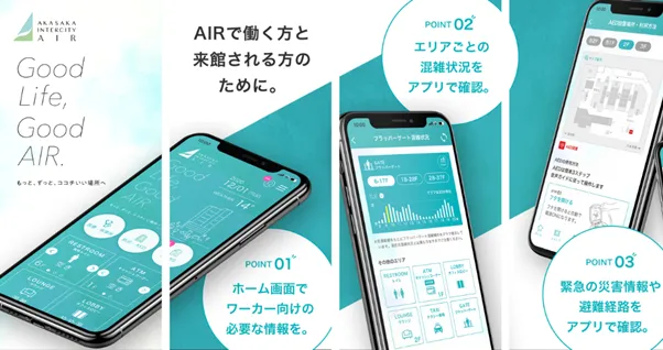 本アプリは、日鉄興和不動産が管理する大型オフィスビル「赤坂インターシティAIR」に勤務するビジネスマン向けに、ビル内の商業施設情報やクーポン、各エリアの混雑状況確認、施設内でのイベントチケット購入などの便利でお得なコンテンツを提供するものです。コロナ禍におけるリモートワークの浸透などワークスタイルの多様化が進むなか、オフィスワークにおいてもより快適に安心して働くための付加価値を創出し、withコロナ時代における多様な働き方を支援いたします。また、赤坂インターシティAIRの入居者や一般の来館者も利用することが出来、施設利用の促進やビル全体の活性化を促します。