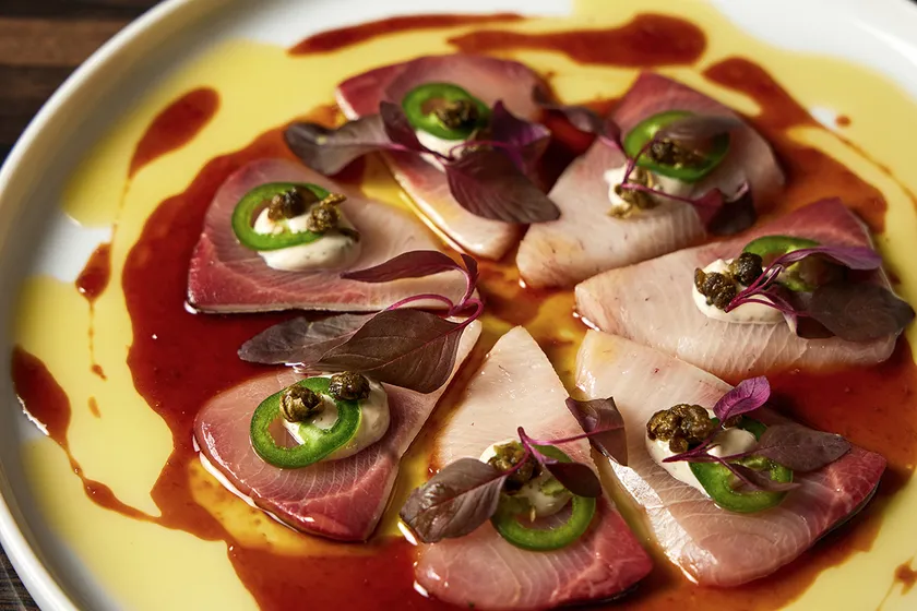 薄切りしたハマチに、生姜、ニンニクを隠し味にした柚子醤油リダクションソースとトリュフの香るアイオリソースとハラペーニョがアクセントにアイオリソースをアクセントに