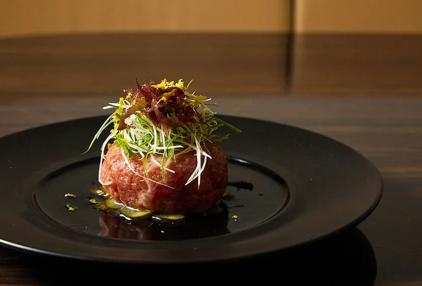 アボカド、コリアンダー、赤玉ねぎなどを包んだマグロに、ピクルスとレモンの皮やクリスピーガーリックを添えて