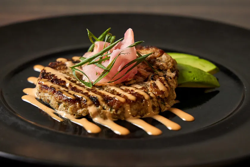 コリアンダー風味のマグロケーキのソテーをロコの味を楽しむシラチャ&アイオリのホットソースで