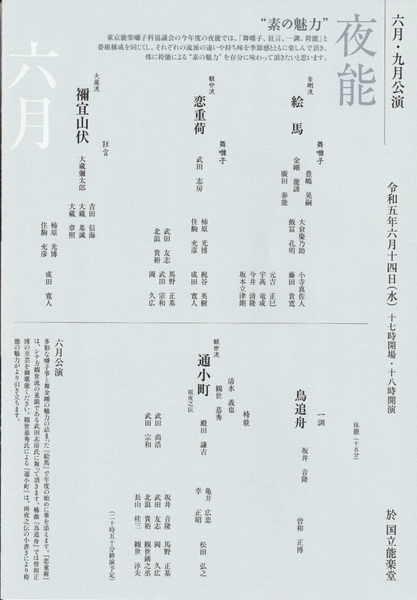 一般社団法人東京能楽囃子科協議会主催『6月定式能』が2023年6月14日(水)に国立能楽堂(東京都渋谷区千駄ヶ谷4-18-1)にて開催されます。