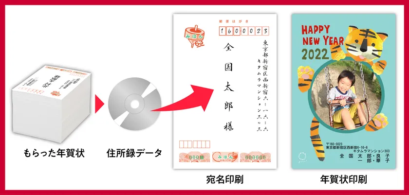 過去に受け取った年賀状を、キタムラ各店舗に持ち込んでください。差出人の住所をエクセルに入力し、住所録を作成。さらに年賀状の両面を画像としてデータ化し、CDでお渡しします。