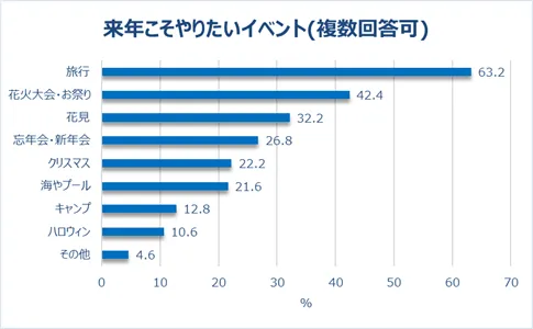 コロナ禍1年目と比べると規制が緩和された面も増えましたが、外出や大規模なイベントの開催は、基本的には自粛が求められる状況が続いています。そこで、来年こそやりたいイベントを調査しました。その結果、1位は「旅行」(63.2%)、2位は「花火大会・お祭り」(42.4%)、3位は「花見」(32.2%)となりました。理由としては「リフレッシュしたい」(48.2%)、「友達とはしゃぎたい」(34.8%)に多くの回答が集まり、遠出してリフレッシュすることや、友人と集まって楽しむにぎやかなイベントを恋しく思っている人は多そうです。
