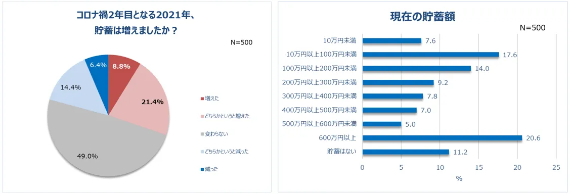 貯蓄の変化も調査しました。その結果、約半数の人の貯蓄に変化があったことが判明。貯蓄が増えた人は、「増えた」(8.8%)、「どちらかというと増えた」(21.4%)を合わせて約3割でした。