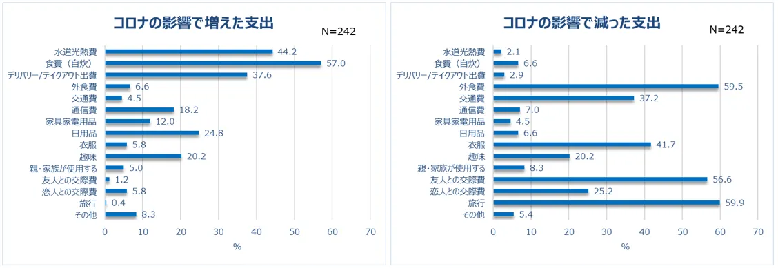 貯蓄が増えた人がいる一方、減った人も一定数いることが分かりましたが、コロナ禍におけるお金の使い道に変化はあったのでしょうか。増えた支出は「食費(自炊)」(57.0%)、「水道光熱費」(44.2%)、減った支出は「旅行」(59.9%)、「外食費」(59.5%)に多くの回答が集まりました。お金の使い方の変化には、おうち時間の増加が大きく影響していると考えられます。また、「友人との交際費」は減った人が多い一方、「恋人との交際費」は増えた人の方が多いことも分かりました。
