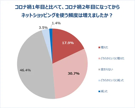 買い物時の接触を避けるため、コロナ禍によって利用機会が増えたと考えられるネットショッピング。ネットショッピングを利用したことがある人を対象に、コロナ禍1年目と2年目の利用頻度について聞いたところ、約半数が「頻度が増えた」と回答しました。新しい生活スタイルが定着するにつれて、ネットショッピングはもはや”定番の買い物方法”として、生活に根付いてきていると言えそうです。
