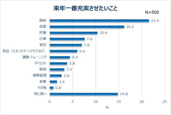 4.来年充実させたいこと「趣味(21.6%)」「恋愛(16.2%)」。