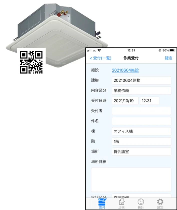 不具合等が発生した建築部位・設備機器に貼り付けたQRコードを読み込むだけで、対象の機器を特定し、設置場所などの情報が自動的に読み込まれるため、発生している事象や結果を入力するだけで、作業の記録が完結します。