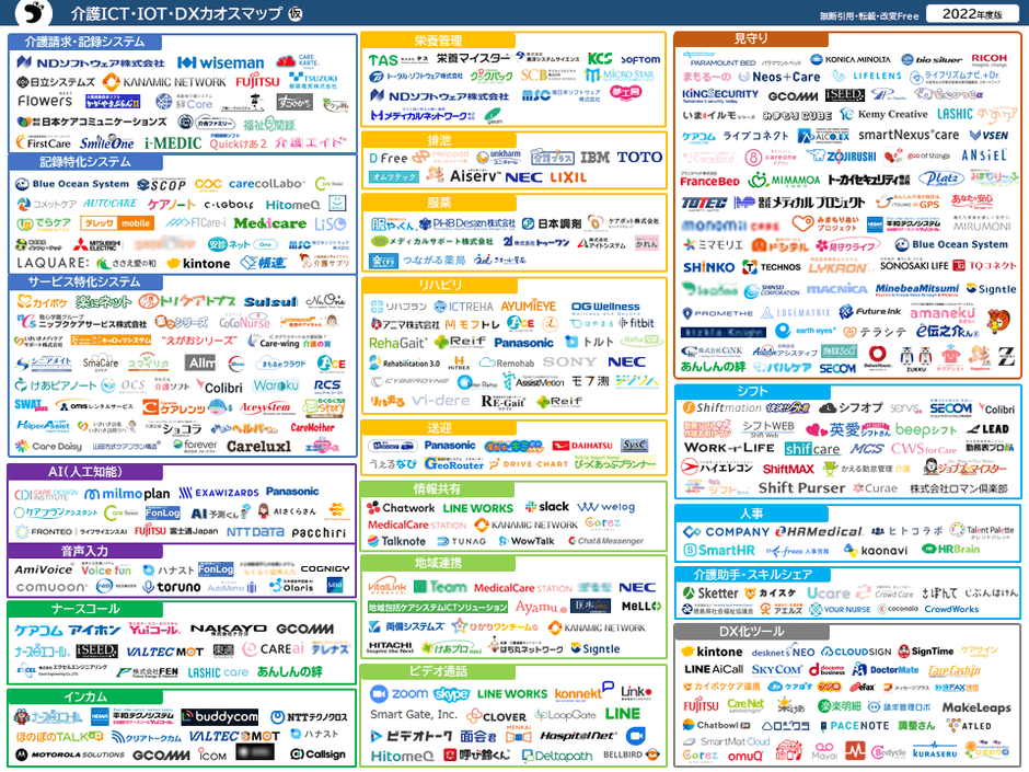 保険制度が始まって以来、様々なICTや介護ロボットなどの機器が登場しております。2021年度において主要なメーカーを独自の視点で分類し、介護分野におけるICTのカオスマップとして公開しました。