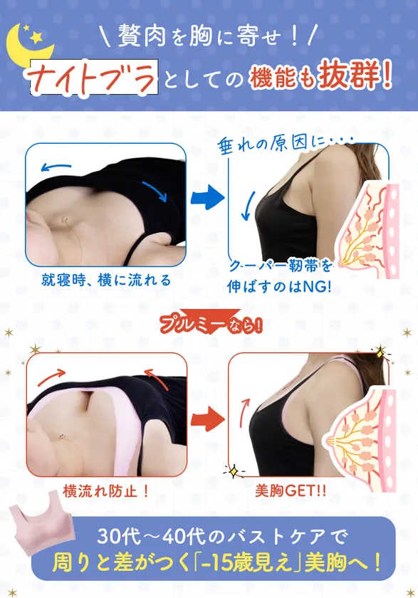 もちろんpurume/プルミーは、ナイトブラとしての機能も抜群で、就寝時、横に流れる事による形崩れや垂れをケアし、美胸に導くサポートを行います。今から始める「バストケア」で、周りと差がつく-15歳見えバストを目指します。