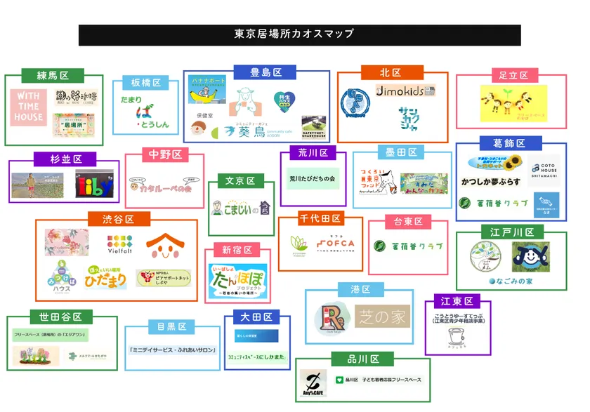 悩みから夢まで話せる東京の居場所「ココトモハウス」(所在地:東京都渋谷区、代表:現王園 健太)および、全国に広がるシェアハウスを活用し、ゆるやかに駆け込めるセーフティーネットを作っていくプロジェクト「Kakedasu」(所在地:埼玉県さいたま市浦和区)は、東京23区の居場所を集めた、「東京居場所カオスマップ」および、居場所を検索できるサイト、東京居場所マップをリリースしました。