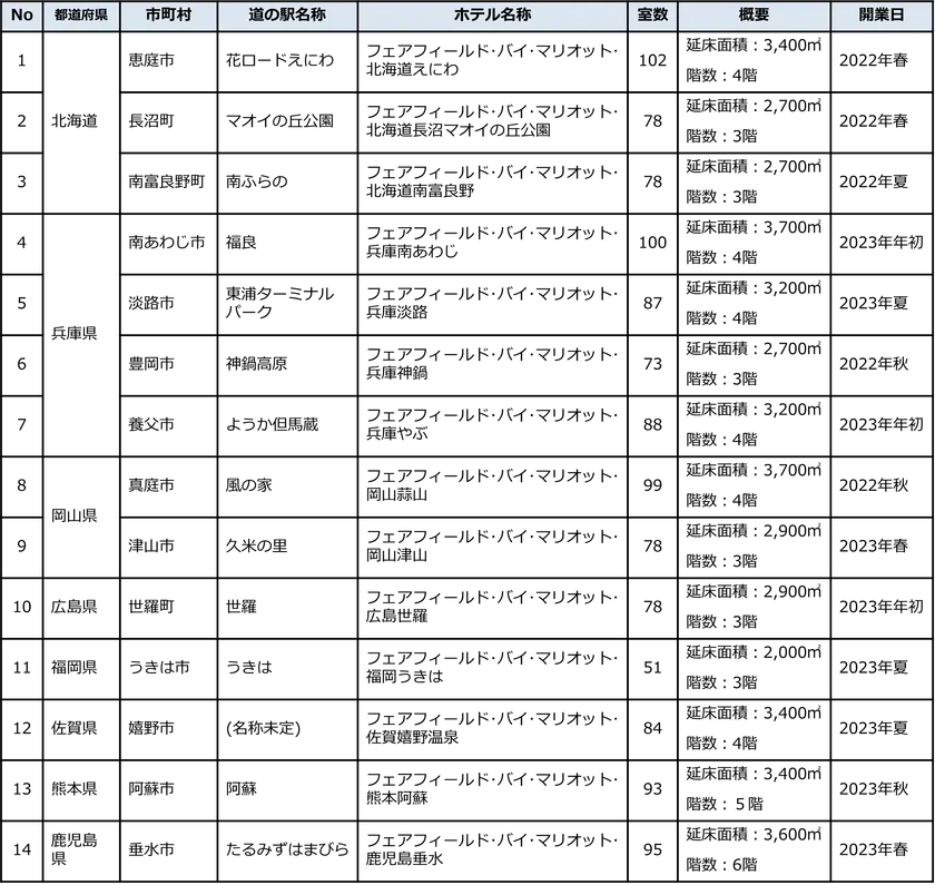 2022年春から2023年秋までに、8道県14か所で合計1,184室を開業する予定です。