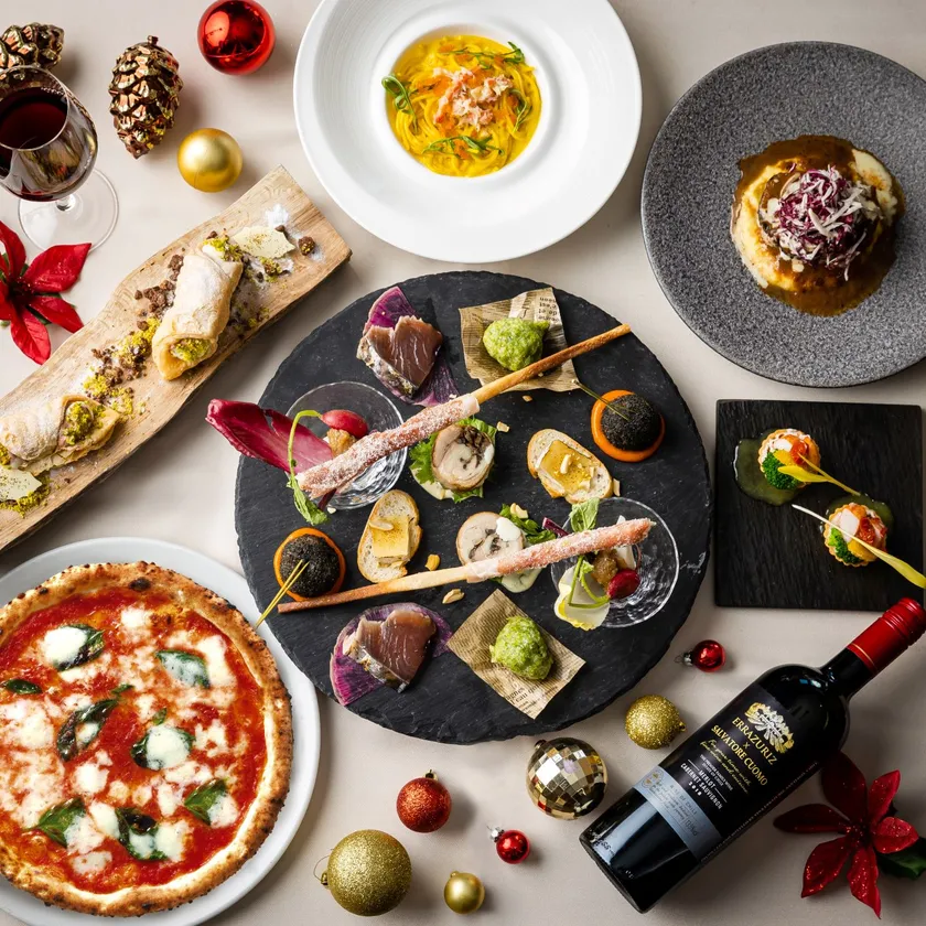 関西地区限定のクリスマスディナーコースはサルヴァトーレらしい遊び心溢れる料理の数々。オマール海老とリコッタチーズの濃厚なタルトが、これから始まるコースの期待を膨らませます。「サルヴァトーレから7種のクリスマスギフト」と称した前菜は、魚介のアランチーニや鶏肉とキノコのインヴォルティーニ、冬野菜のバーニャカウダなど“イタリア”を詰め込んだ華やかな一皿に。自慢の窯焼きピッツァももちろんお楽しみいただけます。