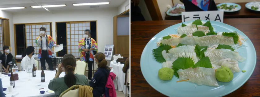 東京、関西、中国・四国、沖縄など遠来の参加者を含め、総勢60余名が参加。「すし海道・佐伯」の握りずしやアワビなど、豊後水道の恵みを一人ずつのお膳で用意され、佐伯市副市長 武田晴美氏による歓迎挨拶で幕開け。佐伯の多種多様な魚介、養殖ブリ・ヒラメなどを、佐伯市農林水産部水産課水産振興係の池田健太郎氏(ととけん1級ホルダー)が説明ののち、かぼすブリと天然ぶり、かぼすヒラメと天然ひらめの覆面食べ比べのほか、カマスやアジ、イトヨリダイの開き干しも楽しまれました。