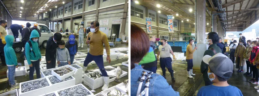 検定試験前の早朝、県外参加者を中心に60名が参加。ガイド役 嶋原隆之氏(株式会社佐伯魚市場 代表取締役社長)が説明を始めると、まわりに子どもたちが集まり、珍しい魚介たちに興味津々。嶋原社長も「今日ほど魚に詳しい皆さんを前に、緊張したことは初めて」とおっしゃっていました。