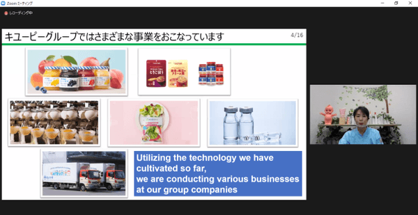 そして、弊社の概要と五霞工場の説明をしてから、マヨネーズの製造ラインを映像で紹介。さらに、参加した学生さんに知りたいマヨネーズの「裏技レシピ」を選んでもらい、動画で視聴していただきました。また、環境への取り組みについても詳しく説明しました。
