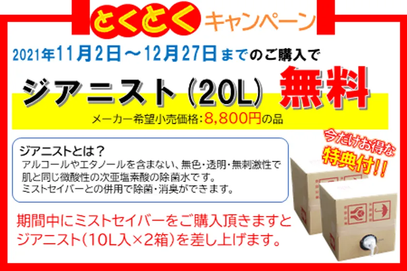 株式会社宮川商店(本社:滋賀県長浜市宮前町12-6、代表取締役:宮川 裕道)は、厚労省が次亜塩素酸水溶液の空間噴霧を認める事務連絡(安全性情報や使用上の注意事項等を守り、適切に次亜塩素酸水溶液の空間噴霧を行ってくださいとの趣旨)を発布したことを受け、2021年11月2日から2021年12月27日までの間、宮川商店本店Webショップにおいて、産業用大型超音波噴霧器「ミストセイバー」をお買い上げいただいたお客様に、もれなく次亜塩素酸水溶液「ジアニスト」20リットルをプレゼントさせていただく「とくとくキャンペーン」を開催いたします。