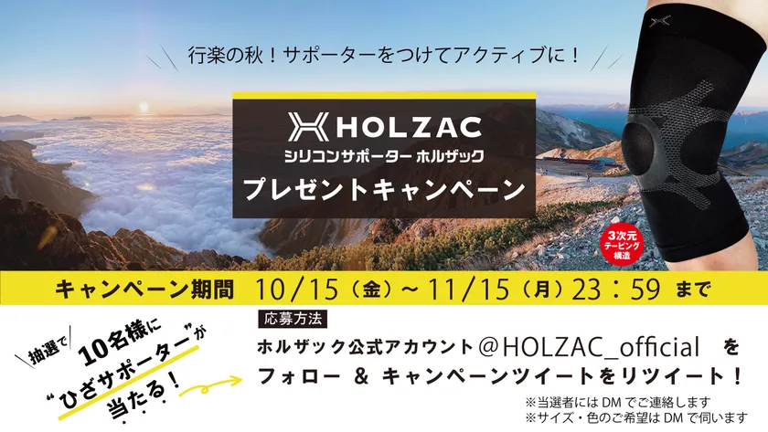 公式アカウントの開設を記念して「HOLZAC ヒザ用 サポーター」を抽選10名様にプレゼントさせていただく、キャンペーンを11月15日(月)まで開催中です。