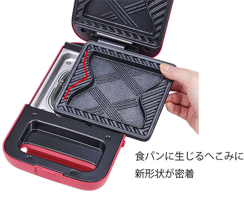 ベーシックな厚みのホットサンドを作る際に中の具材がこぼれないよう、密着度を上げた新形状のプレートは、パンのへこみを想定したリボンのような形でカレーやシチューなど水分の多い具材でもこぼれにくくキレイに焼き上げる新形状です。