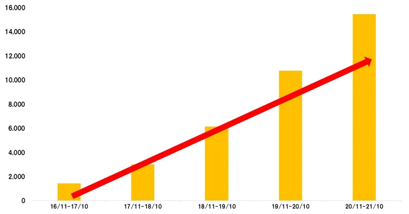 ■年間マッチング件数の推移(2016年11月~2021年10月)