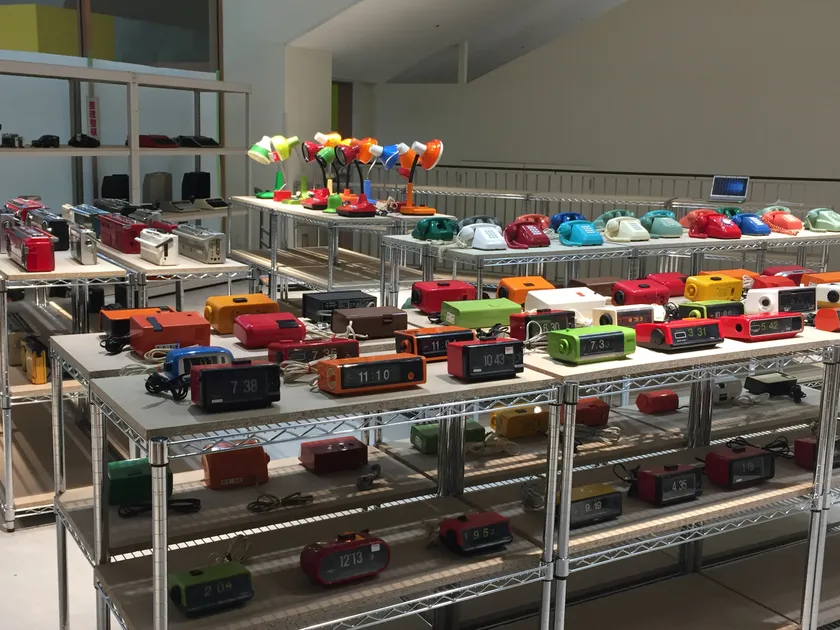 レトロなラジカセやカラフルでポップなパタパタ時計、電話機などを展示、販売