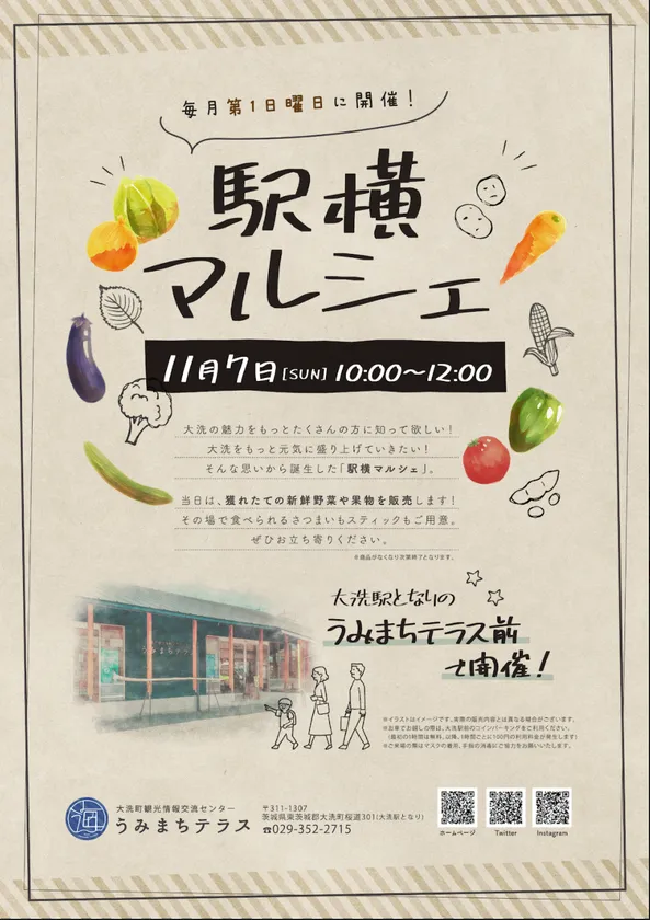 大洗観光おもてなし推進協議会(茨城県大洗町)は、同町の地域活性化を図るため、2021年11月7日(日)10時から12時の間、「大洗町観光情報交流センター うみまちテラス」(大洗駅隣)前のスペースを活用して、旬の野菜や果物の販売を中心に行う『第3回 駅横マルシェ』を開催いたします。