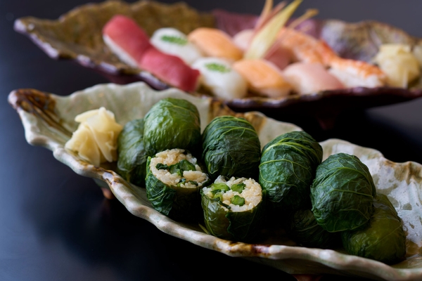 左)香ばしくふっくらと焼き上げた鯖を酢飯の上にのせた福井県の名物「焼き鯖棒寿司」。当館人気の一品を、ぜひご賞味ください。