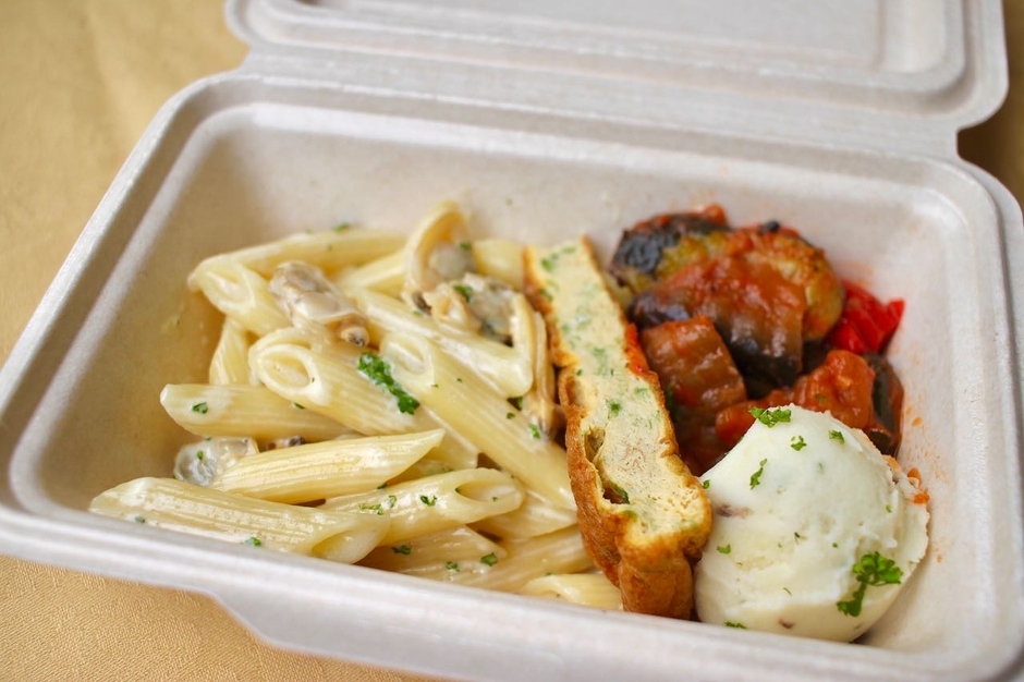 たっぷりのアサリの出汁が効いたクリームパスタと3種類のお惣菜のセットです!