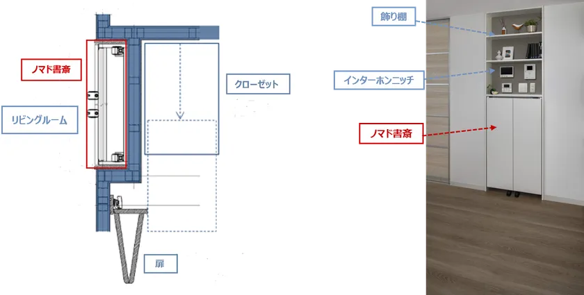 インターホンニッチ(壁面をくぼませてインターホンなどを付ける空間のこと)と、その裏側にあるクローゼットの扉の収納のためにできる空間です。普段、住宅の中で“デッドスペース”になっている場所を活用することで、部屋の広さに影響することなく、『ノマド書斎』の収納を可能にしたのです。