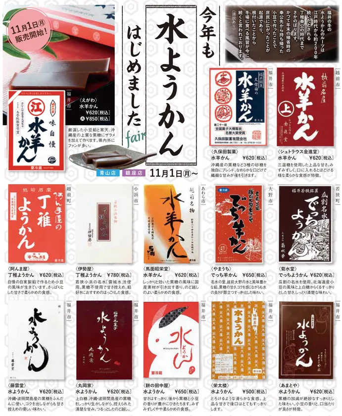 福井県アンテナショップの青山店「ふくい南青山291」、銀座店「食の國 福井館」では11月1日(月)から11月30日(火)までの期間、福井県の老舗や人気店の水ようかんが、都内にいながら味わえる「“今年も”水ようかんはじめましたフェア」を開催しております。