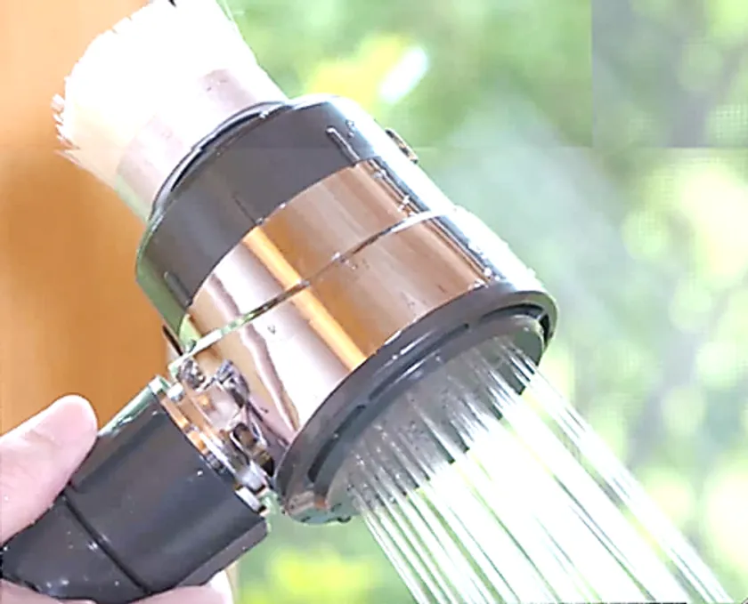 *流水で回転するブラシ機能とシャワー機能のW機能が特長のシャワーヘッド