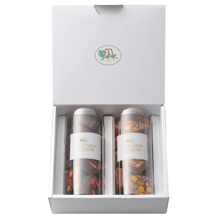 ブラウニーの製造過程で出る切れ端を破棄するのではなく、有効活用したいと考えて生み出された商品です。“カリッサクッ”な食感を出すため2時間半かけて二度焼きし、チョコレートをコーティングしたオリジナル食感。ショコラティエ マサールオリジナルミルクチョコレート(マサールラクテ38%)と、オリジナルブレンドのスイートチョコレートが1本ずつ入った2種類の味が一度に楽しめるセットです。