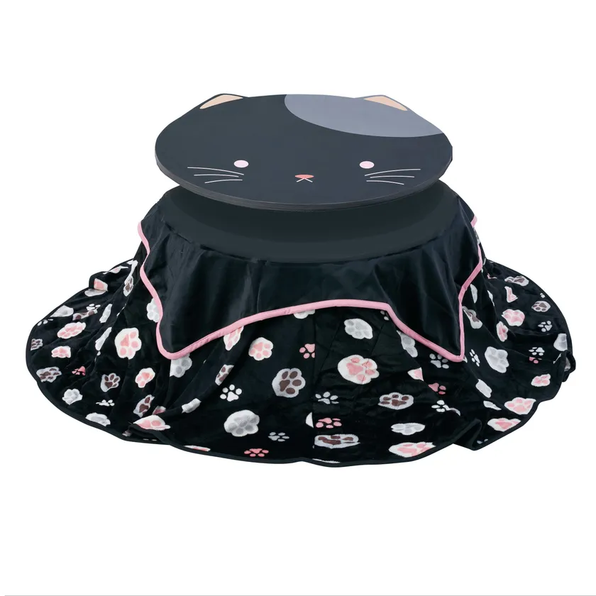 かわいいネコのイラストが描かれた天板、こたつ布団とサロン付のこたつ卓、300W石英管ヒーターを組合せたオールインワンこたつセット「ネコったつ」の登場です。