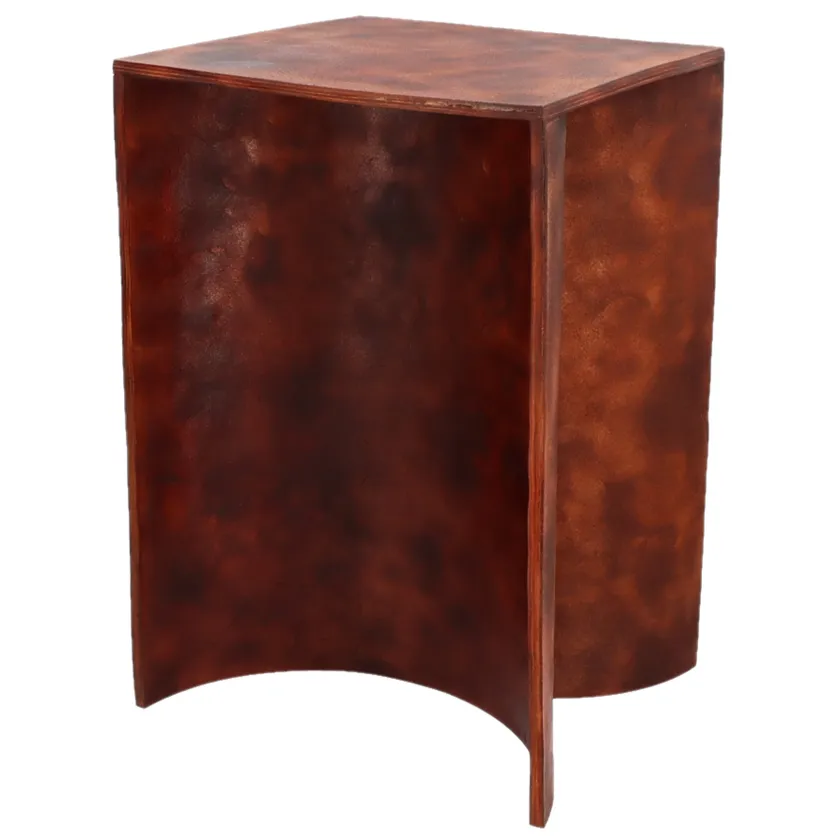 「“THL”は床革と膠を用いた撓め革のスツール。日本の約千年前、武具の製造時に皮を膠液に浸し槌で打ち固めた撓め革が存在した。撓め革は時代が進み必要性を失ったが、硬質な材として見ることで新たな用途で利用できる。撓める加工法は古典的だが、生物から獲れる材を余す事なく活用することはエシカルである。武具から家具へと革に内在する意味の更新が用途を拡張すると共に、資源の使用法の再考を暗示させるだろう」