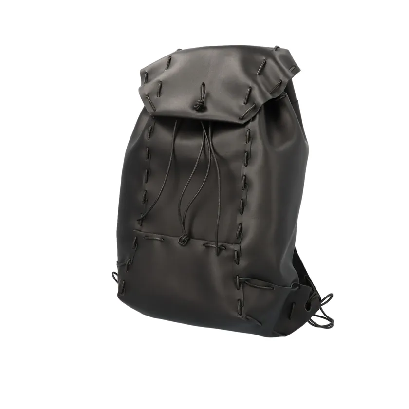 「革 100%のバックパック。1枚の革から、ミシンも金具も接着剤も一切使用せず1本の革紐のみでまとめてバックパックをつくりました。革さえあればつくることできるバックパックです。型紙も1枚、革紐も接ぐことなく1本のみでしあげることを目指しました。機材に頼らない、石油由来の製品に頼らない、革と人間の手のみでつくることが可能なバックパックです」