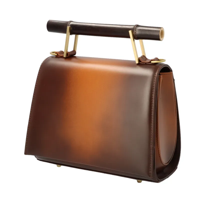「手仕事だからこそ扱える素材」にこだわりデザイン・制作しました。本体にはパーツごとに染色したガラスレザーを、ハンドルには土佐の黒竹を使用しました。どの部分をその向きで使用するかは地元・墨田の竹問屋に目利きをしてもらっています。デザインのアクセントにもなっている真鍮金具は、ハンドルに合わせたオリジナル。熟練した職人たちの手仕事によって生まれた素材を、1点のバッグに仕立てました」